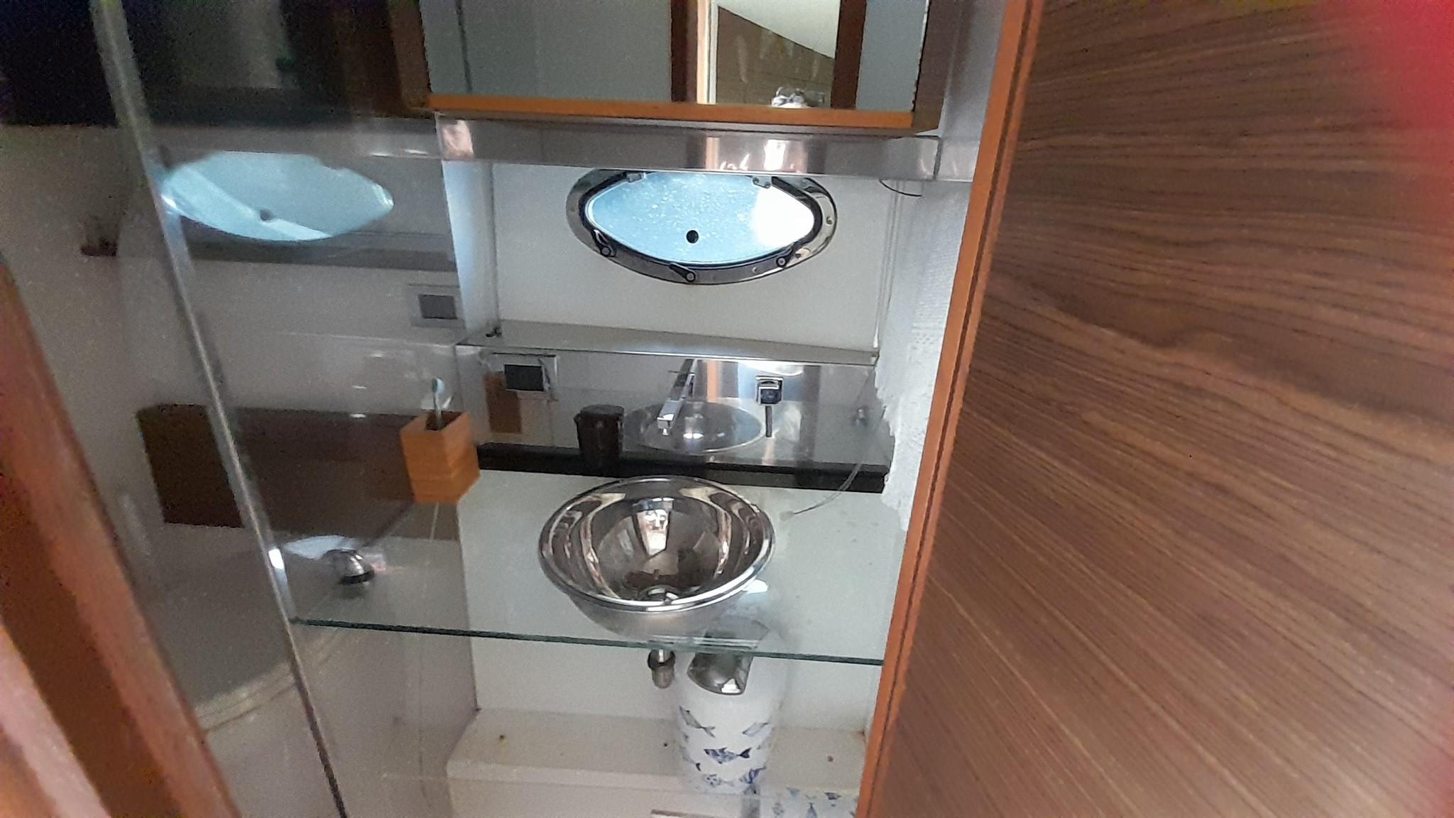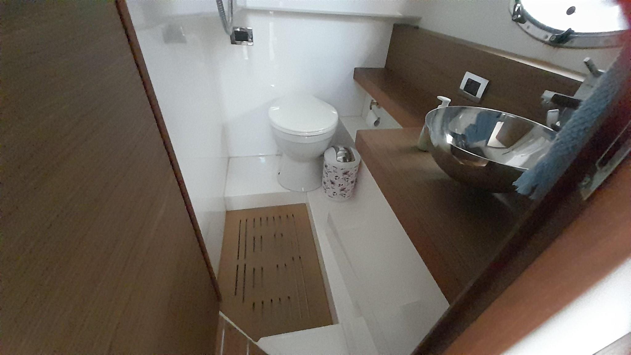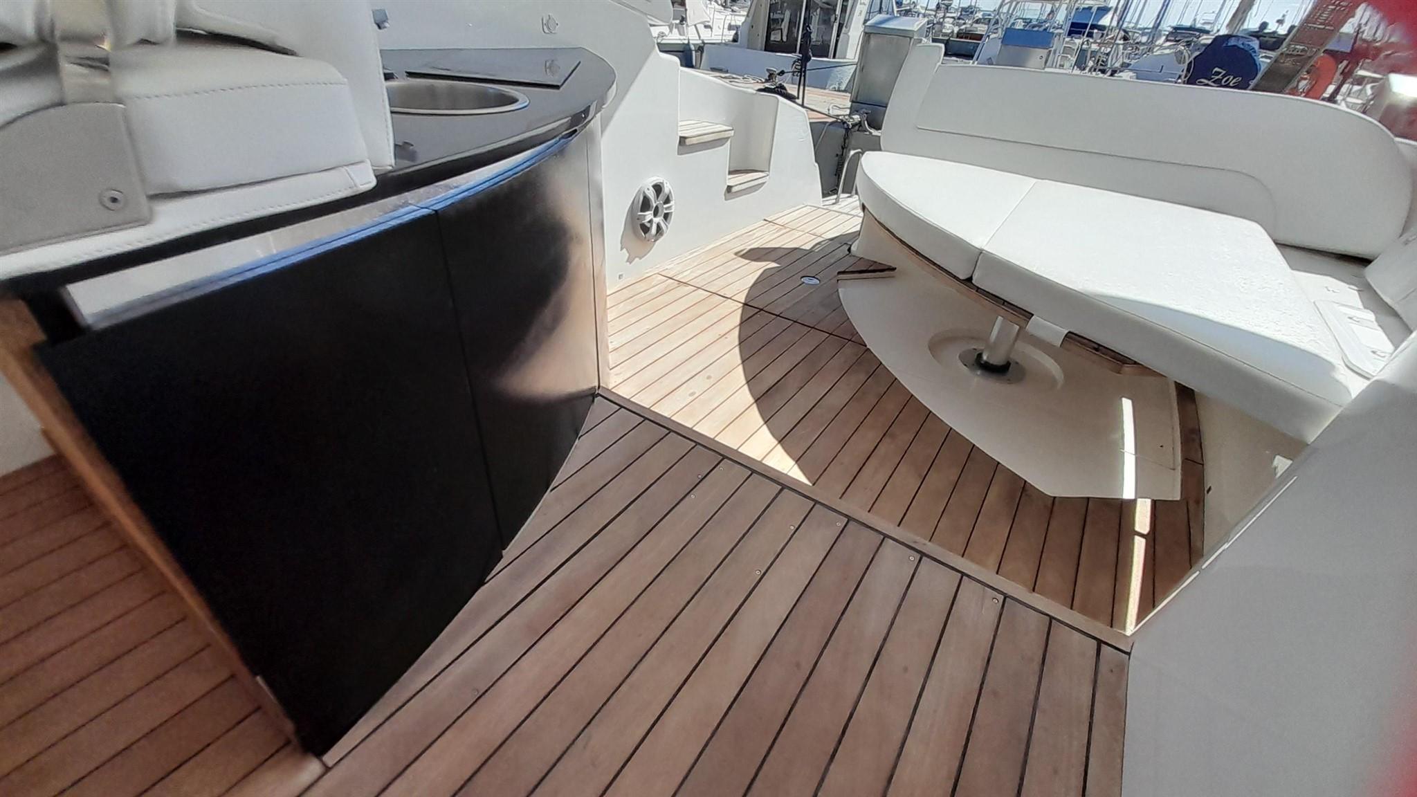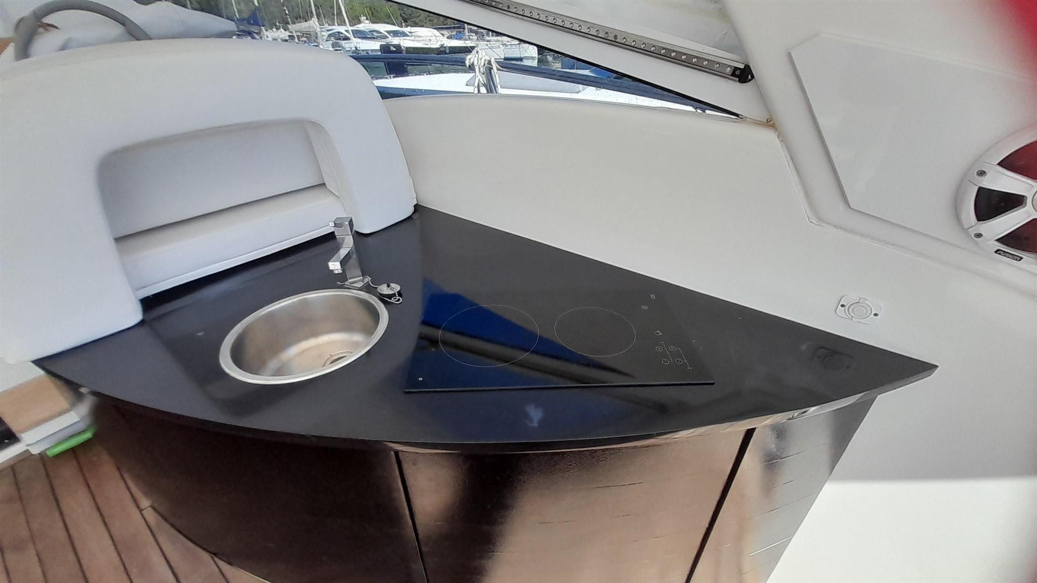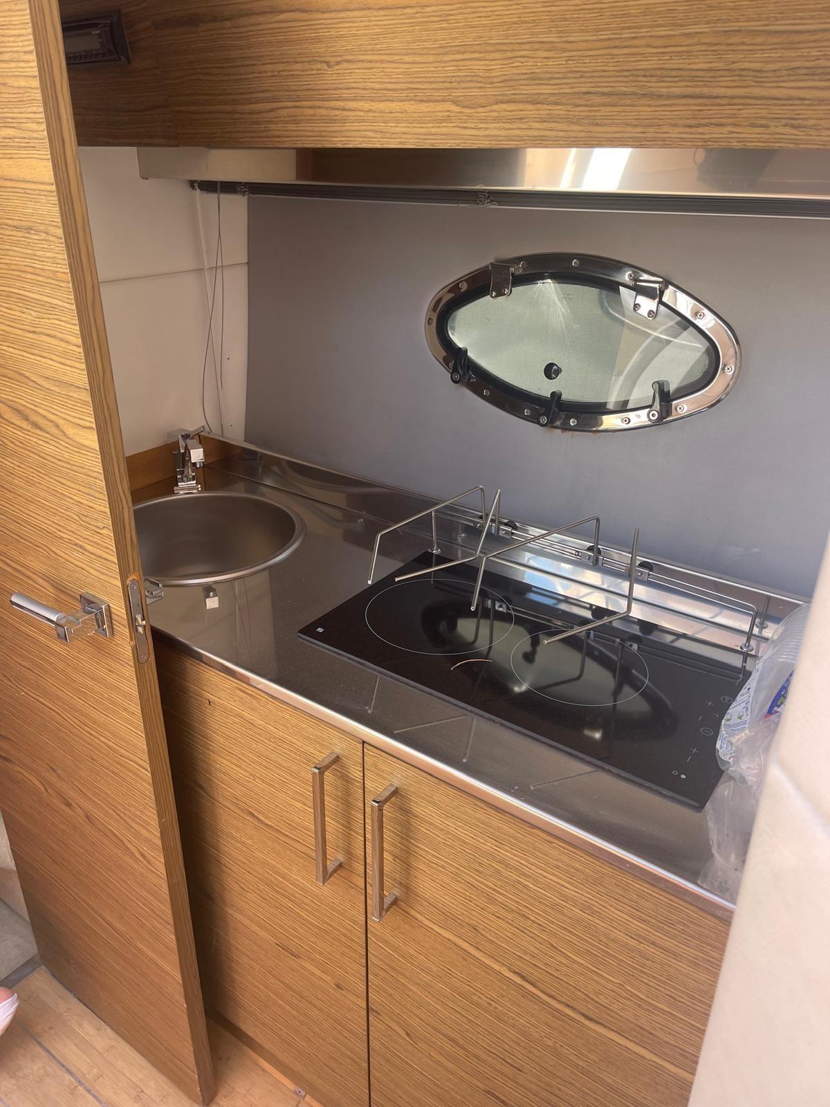 La zona cucina è duplice: una è posizionata all’interno, ben attrezzata per l’uso quotidiano o in navigazione; la seconda si trova all’esterno, nel pozzetto, perfetta per vivere momenti conviviali all’aria aperta, senza rinunciare alla praticità.