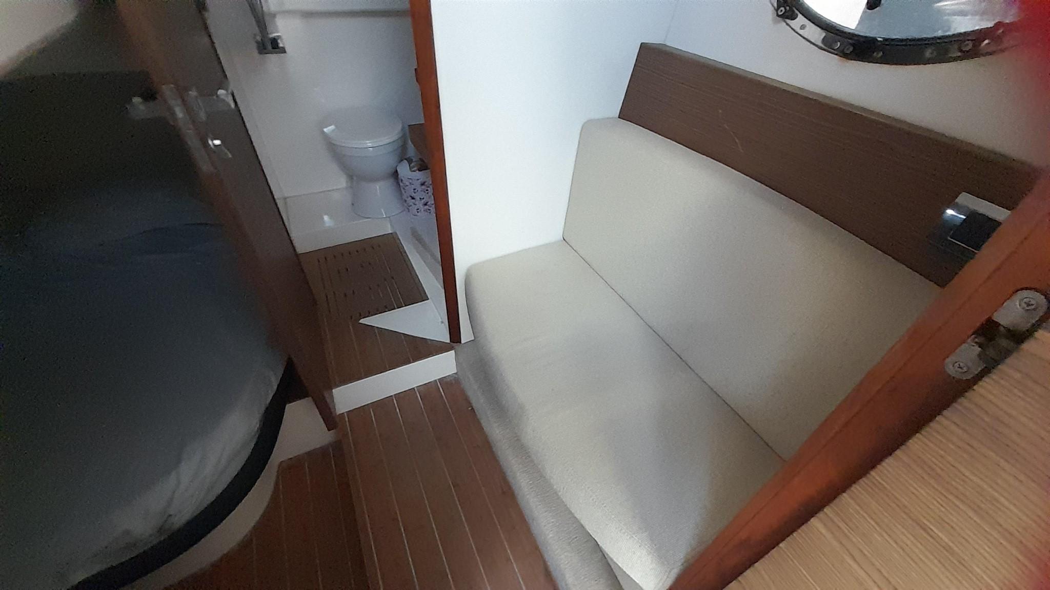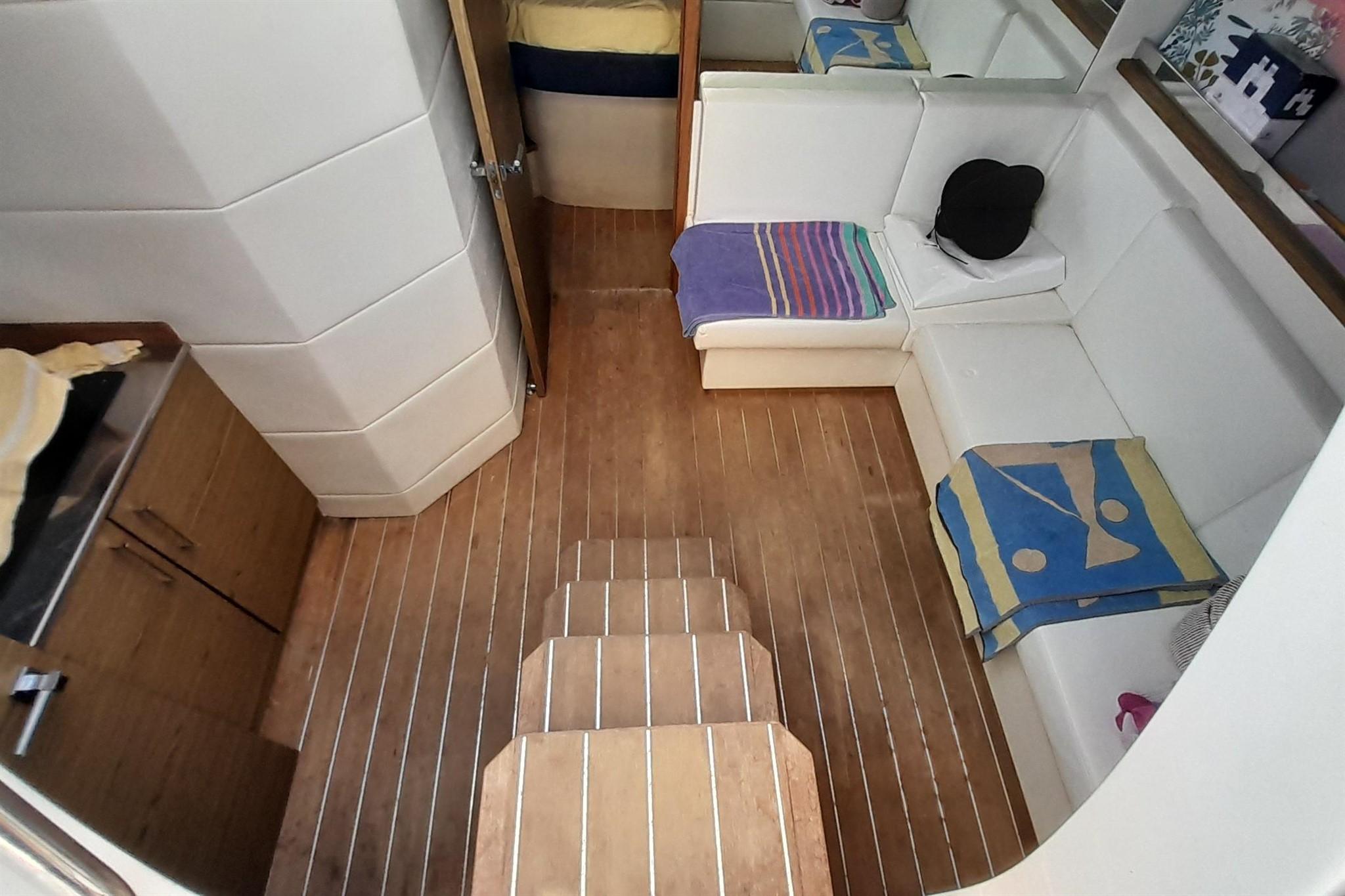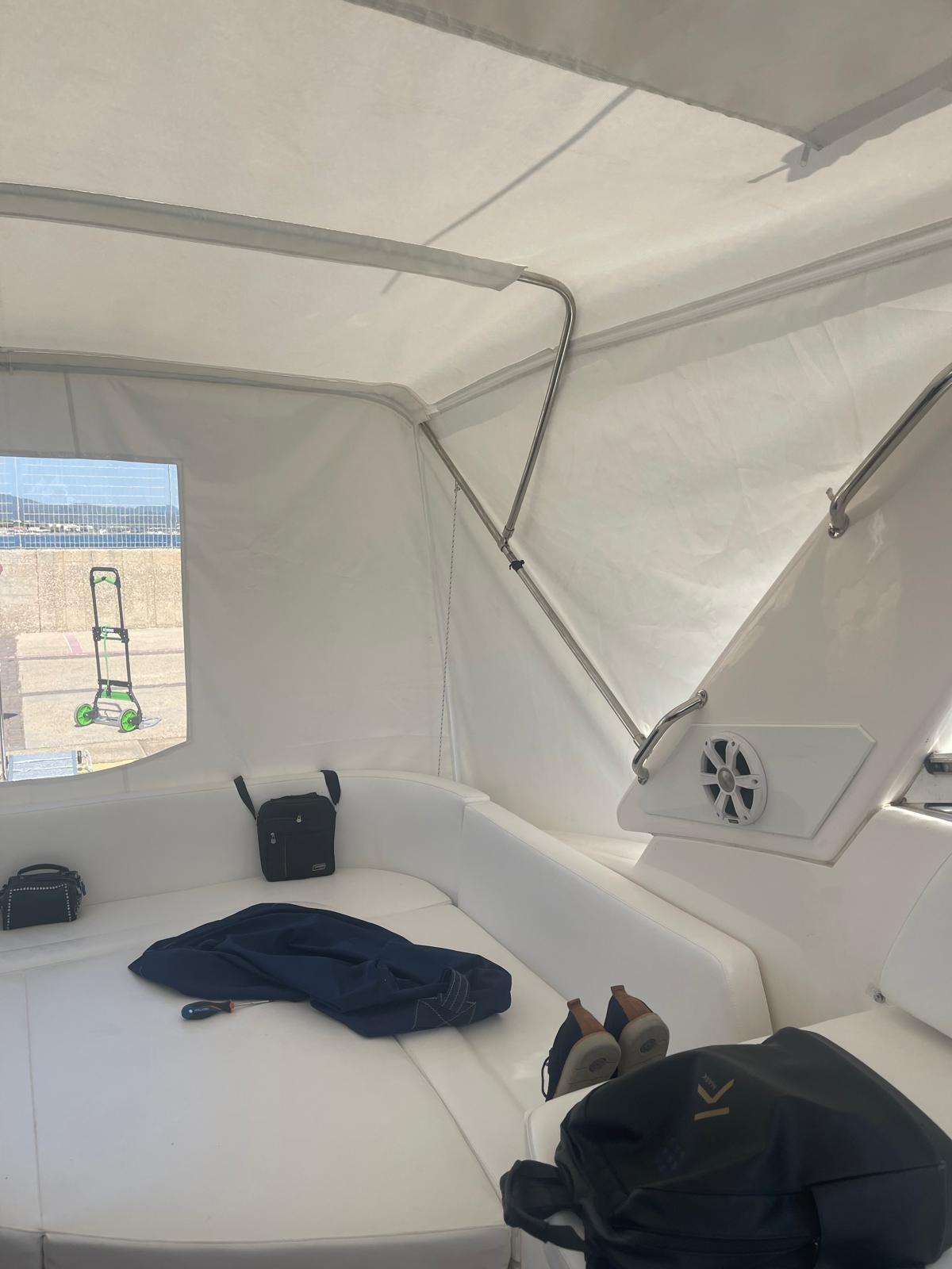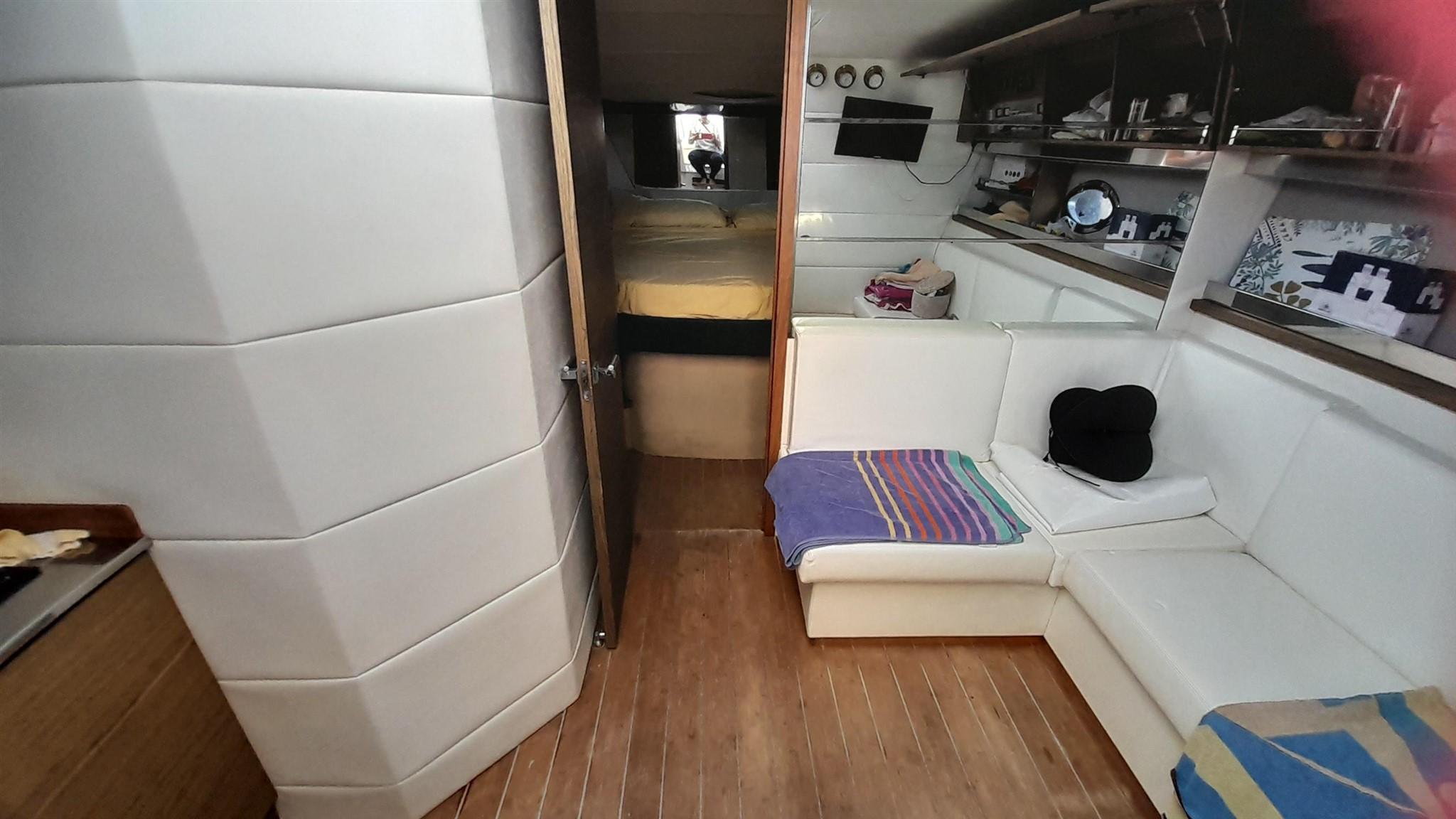 Gli interni, distribuiti su una lunghezza complessiva di circa 11 metri, offrono due cabine indipendenti, ognuna con il proprio bagno, un elemento raro in questa categoria di imbarcazioni. Il cuore dell’ambiente interno è rappresentato da una dinette ampia e luminosa, arredata con gusto contemporaneo e dotata di divano trasformabile in letto, ideale per ospitare in modo comodo anche eventuali ospiti aggiuntivi.