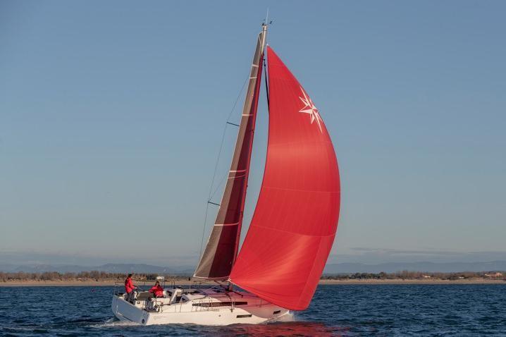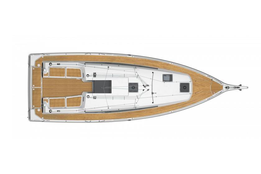 Manovre • Sartiame • Winch di tuga e winch primari Harken® • Attrezzatura di coperta Harken® • Albero classico e boma in alluminio anodizzati • Boma con vang rigido e trozza abbassata per facilitare le mani di terzaroli • Randa steccata e genoa avvolgibile con protezione antiUV • Manovre fisse in monotron discontinuo inox • Lazy bag e lazy jack • Rinvio scotte al timoniere, alla tedesca • Ampia scelta di vele Costruzione • Scafo stratificato in fibra di vetro e resina polyestere monolitico. Gel coat ISO “barrier coat” di protezione anti-osmosi • Controstampo a scafo integrale realizzato in infusione, facile accesso totale ai madieri, rinforzi stratificati nelle zone di fissaggio delle sartie • Coperta in iniezione con sistema Prisma Process® per miglior controllo di qualità, aspetto e struttura. Permette una riduzione di peso del 30 % rispetto ad un ponte tradizionale • Doble timón articulado, con rodamientos autoalineadores y textil para mejorar sensibilidad y el placer de la navegacion • Estrave invertido que permite aumentar la longitud de la línea de flotación al tiempo que mejora las líneas de agua • Prua fuori dall’acqua che riduce la superficie immersa con venti leggeri Coperta • Ruote del timone inox rivestite in cuoio • Scala bagno telescopica • Tambuccio ingresso con porte apribili su cerniere Pozzetto • Passi d’uomo flush deck • Finestrature in acrilico scuro • Rifiniture esterne e sedute pozzetto • Bitte d’ormeggio in alluminio al baglio massimo • Aperture nelle draglie