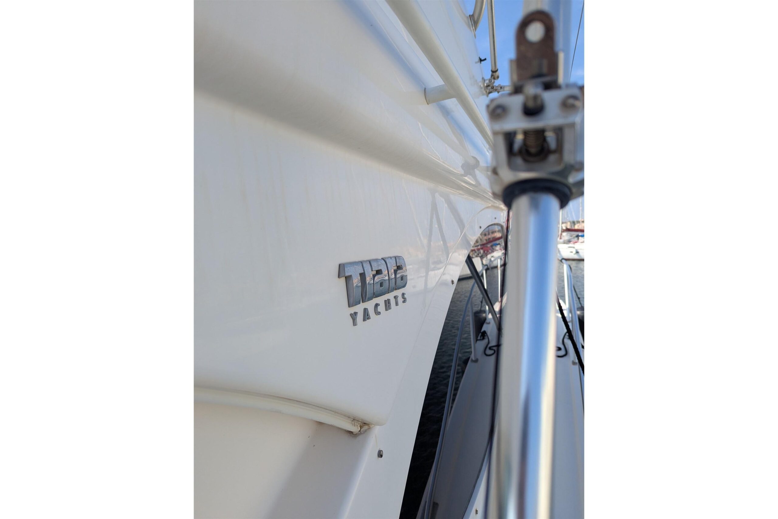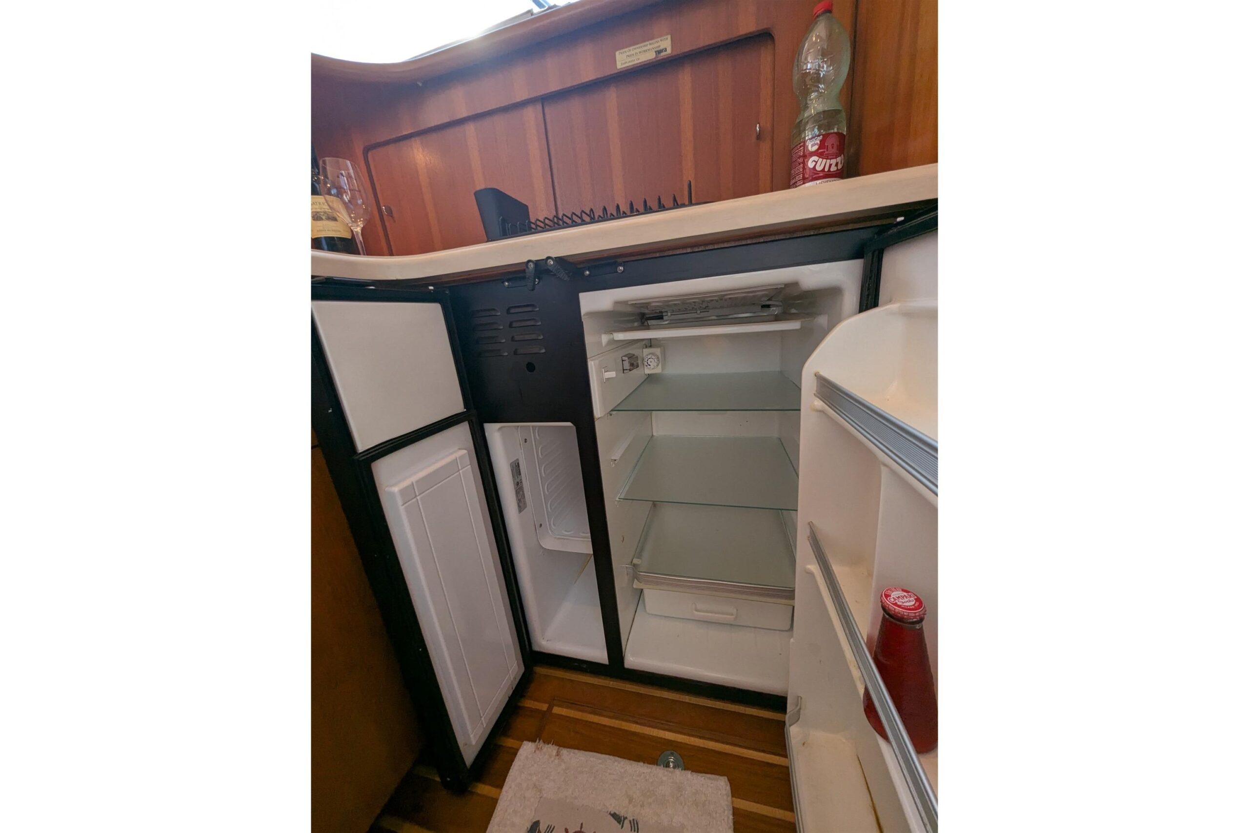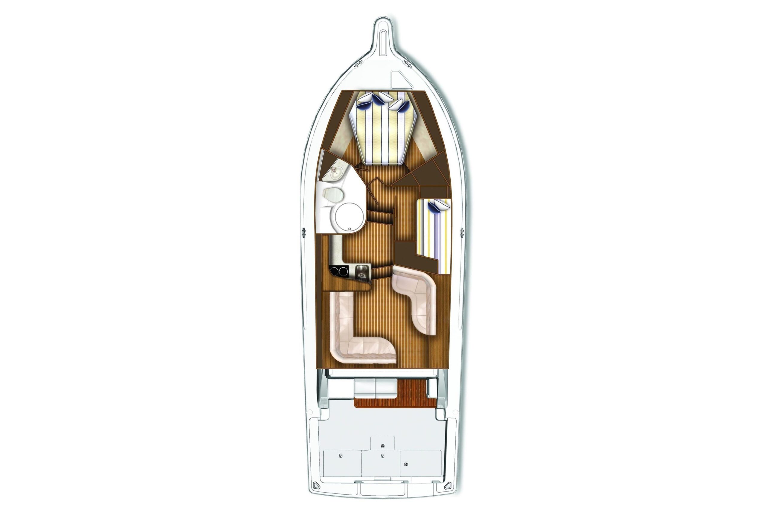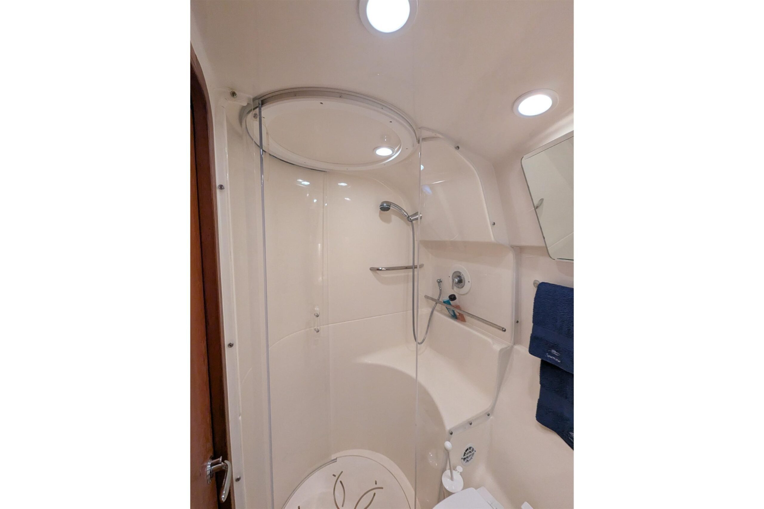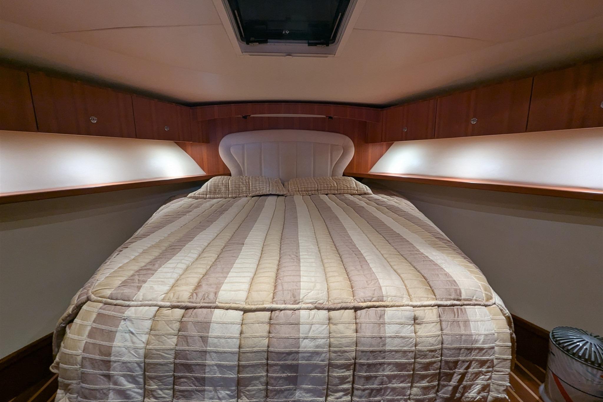La zona notte comprende due cabine — una armatoriale e una ospiti — e un ampio bagno con doccia separata, rifinito con materiali di qualità.