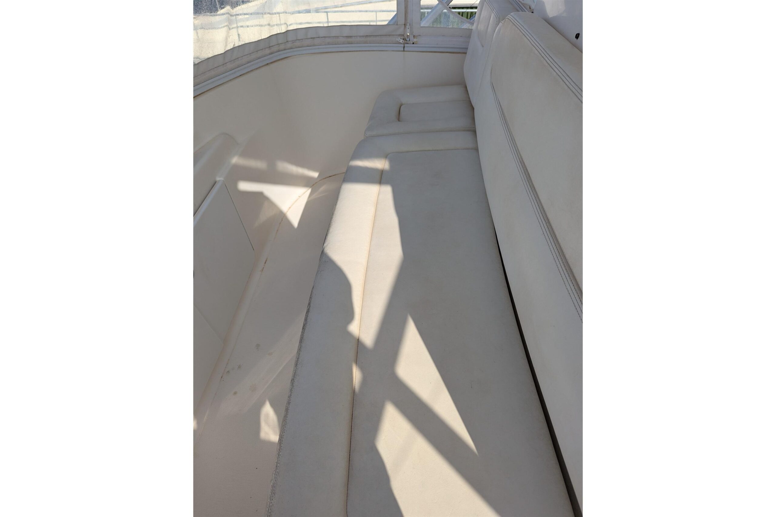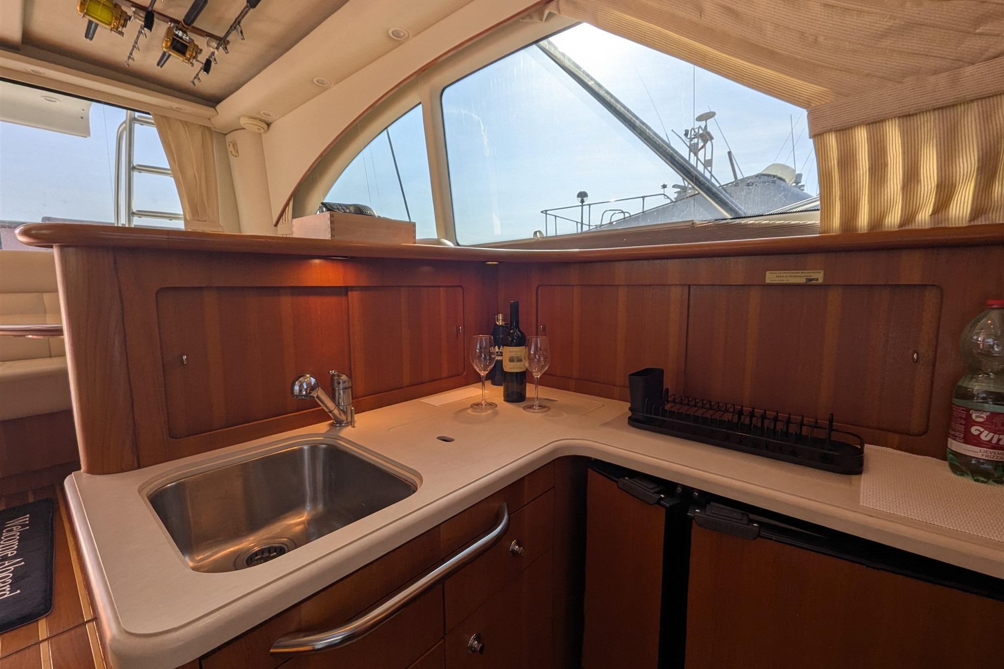 Gli interni in teak sono ampi, luminosi e ben organizzati, con grandi vetrate laterali e di poppa che donano all’ambiente una piacevole sensazione di spazio e continuità con l’esterno.