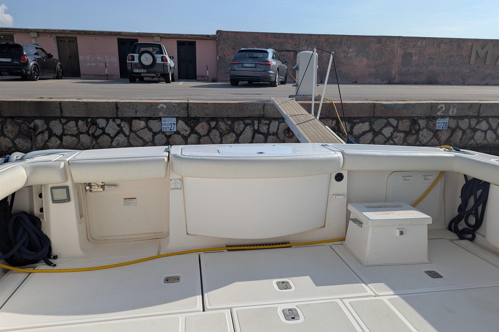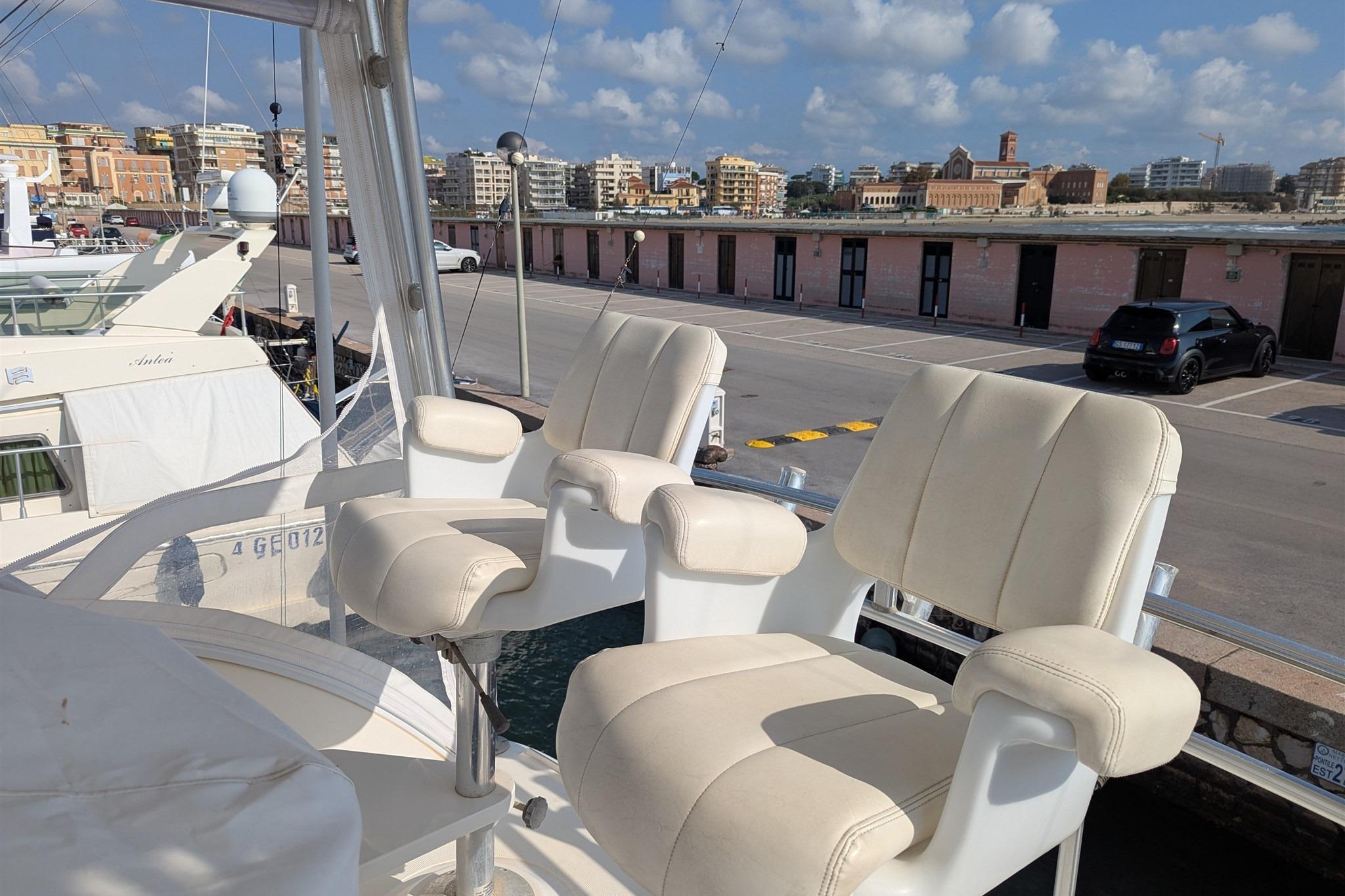 La plancia di comando sul flybridge è completa di moderna strumentazione elettronica integrata, volante in alluminio da 15”, due comode poltrone di guida e una panca prodiera con frigorifero dedicato, pensata per offrire comfort anche durante le uscite più lunghe.